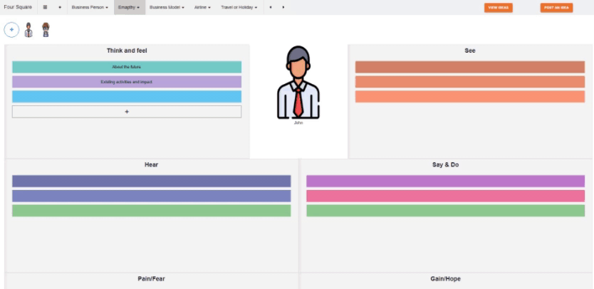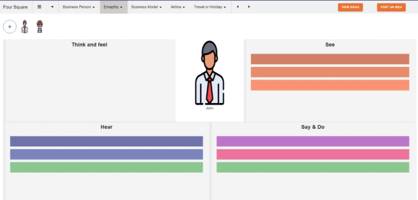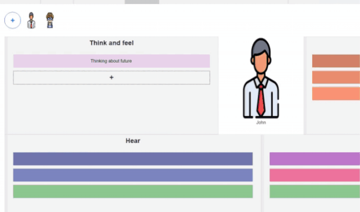 To give your map the feel you want, you can customize your empathy map cards by adding different colors according to the different personas.