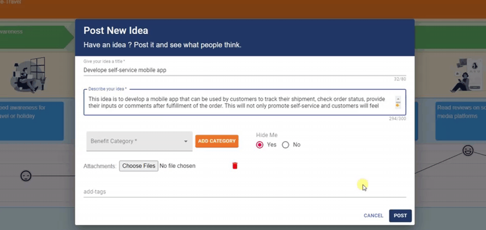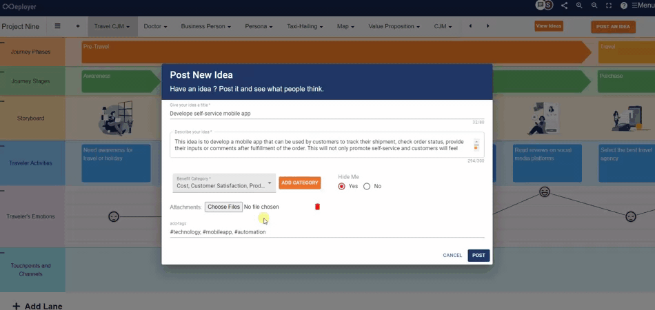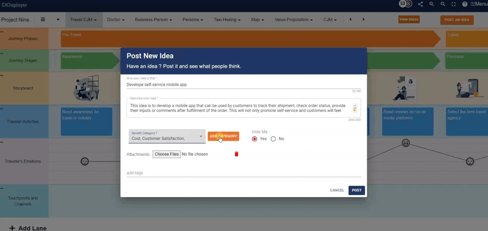 With CXDeployer's ideation management, you can capture more ideas if you want to change your journey map. Employees should be able to submit ideas as they come up with them.